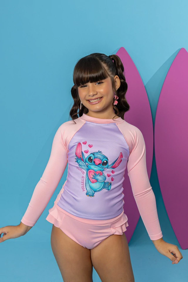 Biquni de Manga Longa estampado com o Stitch e calcinha lisa com babadinhos nas laterais.