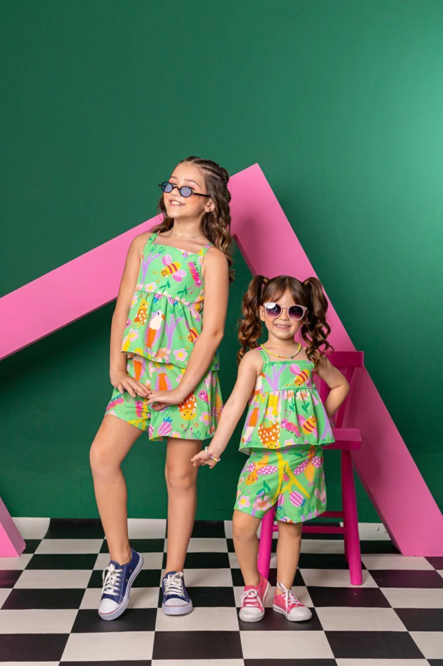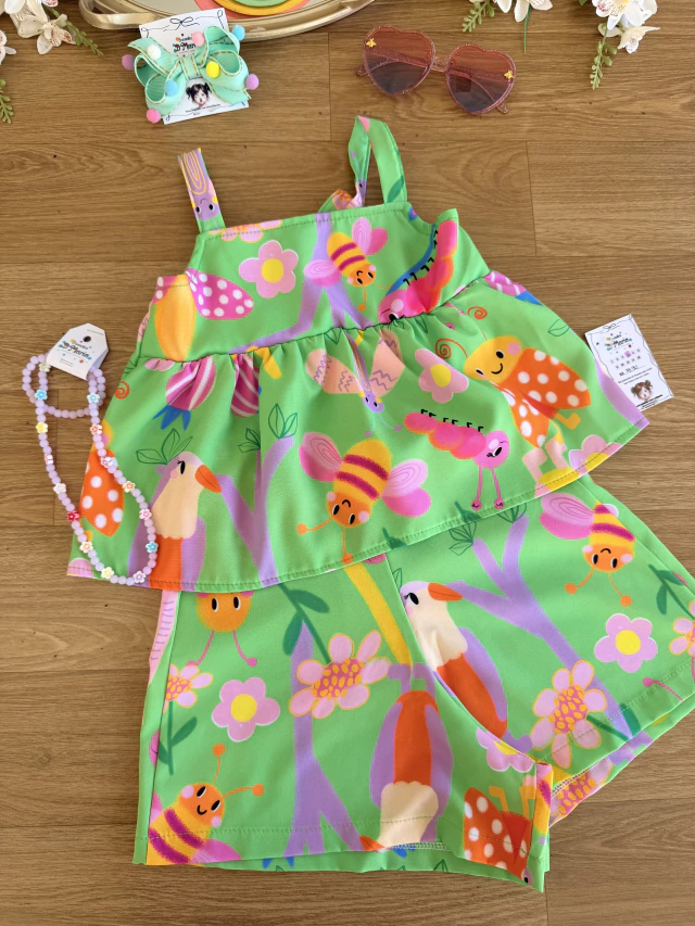 Conjunto Infantil composto por blusa com alça de elástico colorido e bermuda de elástico.