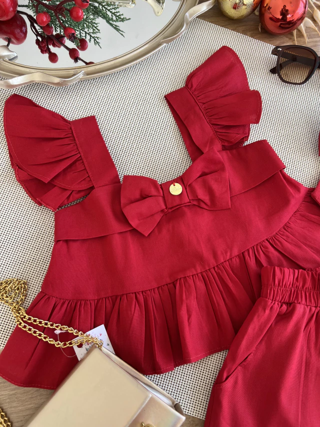 A blusinha possui alças com babados estruturados, detalhe de laço central com botão dourado e modelagem soltinha, que dá movimento e um toque sofisticado. O short vermelho, em tecido leve e macio, conta com cós elástico embutido, proporcionando ajuste ideal e liberdade para brincar e se divertir.