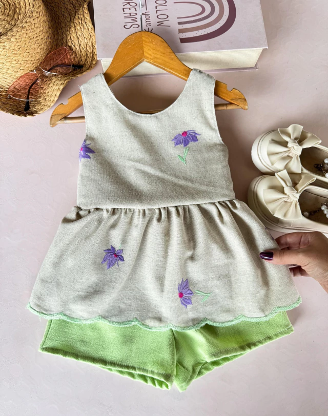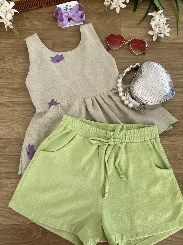 Conjunto Infantil composto por blusa confeccionada da leise e shorts de crepe com elástico nos cós.