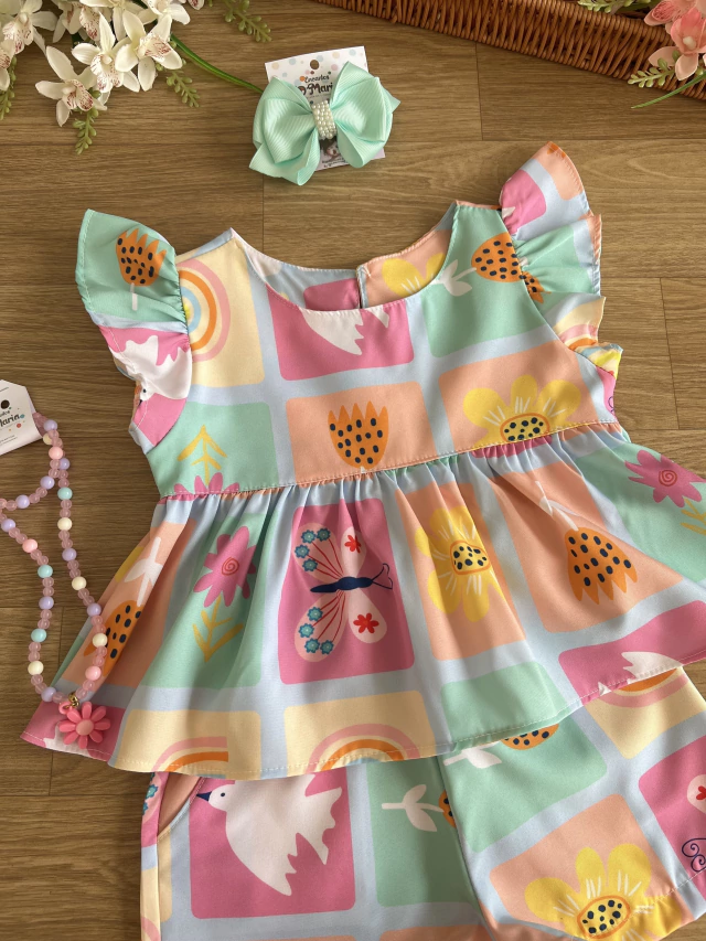 Conjunto Infantil Estampado com Arco íris com fundo lilás composto por: blusa com golinha redonda, manguinha franzida com detalhe de peplum com bermuda com cós de elástico.