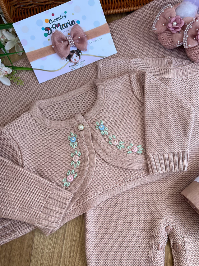 Este conjunto de Saída De Maternidade De Tricô Para Menina no tom Nude é perfeito para o primeiro look da sua pequena, trazendo elegância e aconchego em cada detalhe. Composto por um delicado macacão de tricô, um casaco bordado com flores de rococó e uma manta, que garante o máximo de conforto e estilo para o bebê. O bordado artesanal de flores de rococó no casaco adiciona um toque sofisticado e único, ideal para momentos especiais como a saída da maternidade. A tonalidade de rosa envelhecido confere um ar clássico e atemporal, enquanto os acabamentos impecáveis proporcionam suavidade e aconchego.",