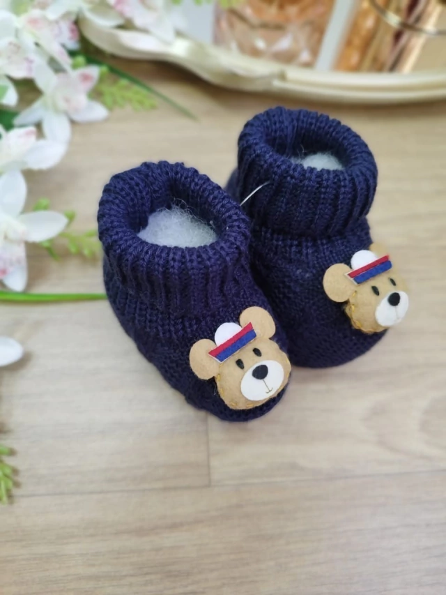 1 Par de Sapatinhos Tricot Acrílico 100% Antialérgico, com aplicaçãoa de urso marinheiro de feltro.