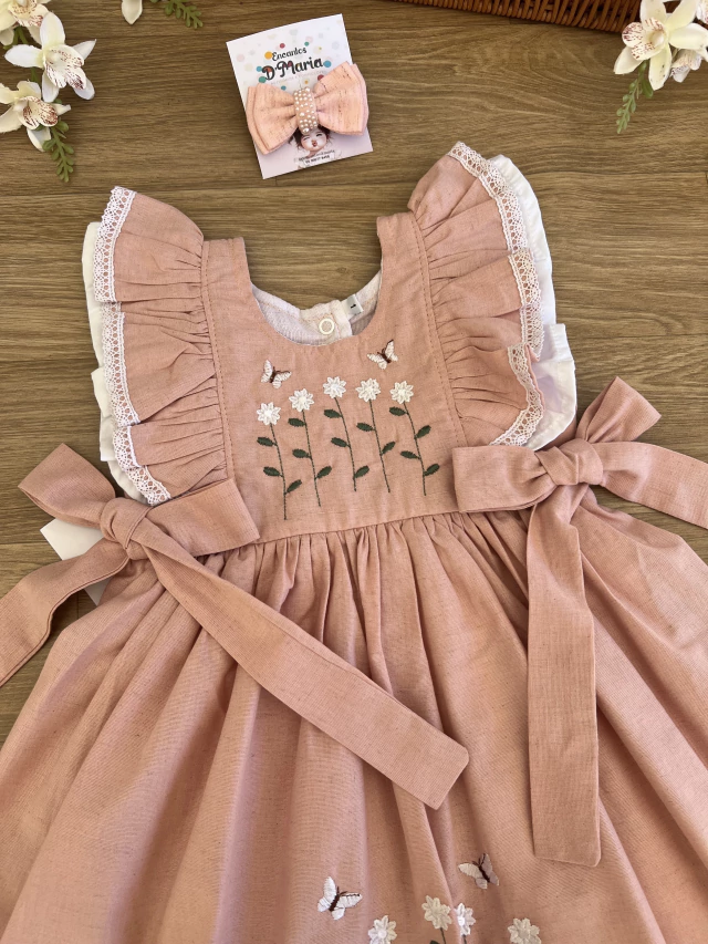 Um vestido que traduz a delicadeza da infância em cada detalhe. Confeccionado em tecido de Linho