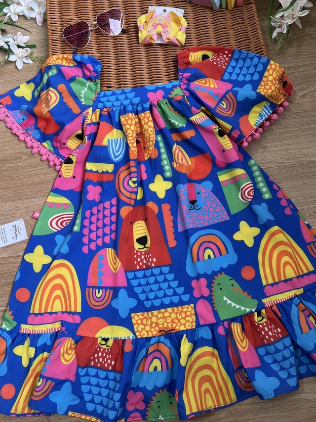 Vestido Trapézio com manga godê e aplicação de grelô colorido.