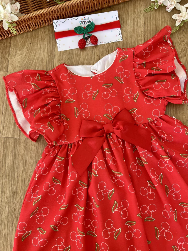 Vestido Com Manga e Laço _ Cereja Encante sua pequena com este vestido de bebê confeccionado em algodão macio e estampado com delicadas cerejinhas, perfeito para trazer alegria e conforto no dia a dia.