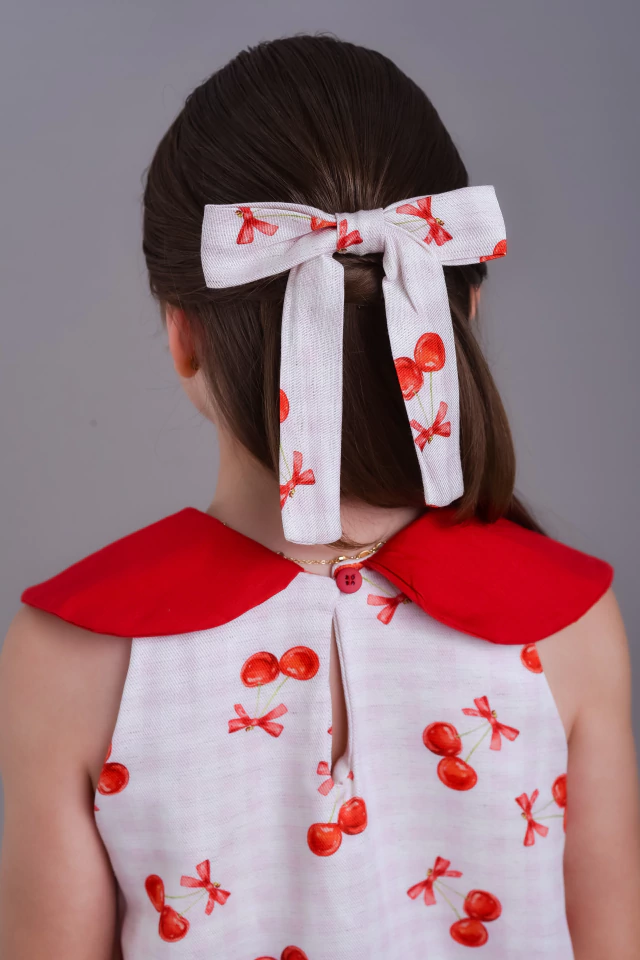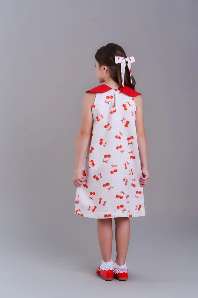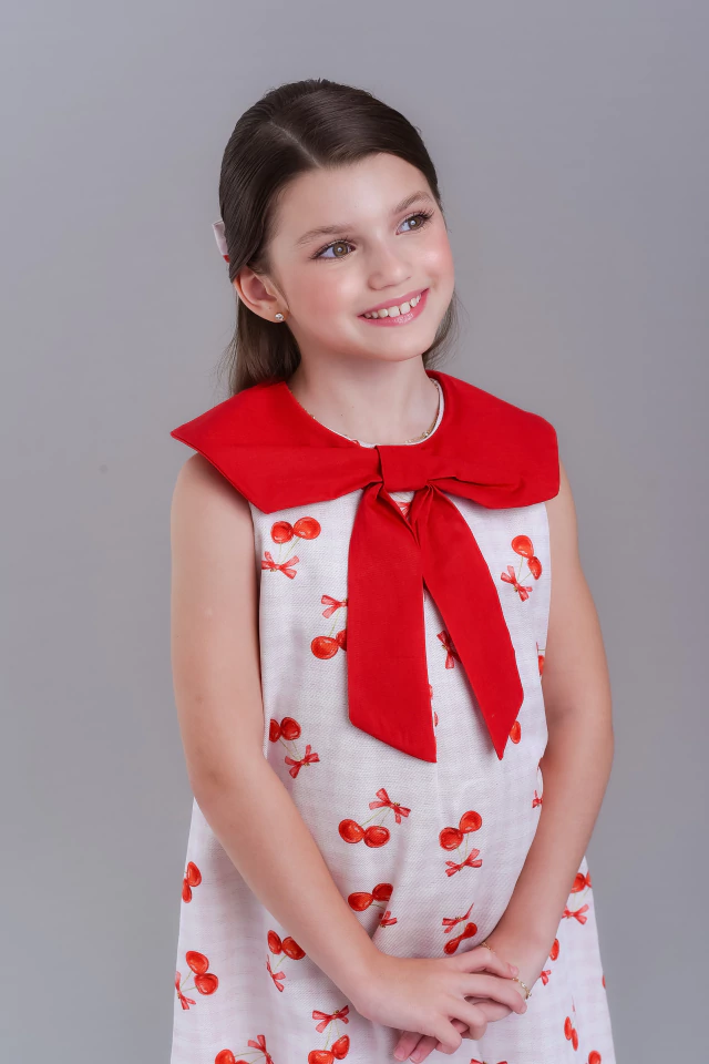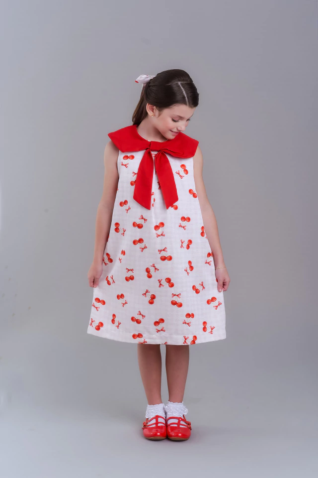 Vestido confeccionado em Tecido 100% Algodão na modeladora trapézio com detalhe vermelho formando um laço na gola.