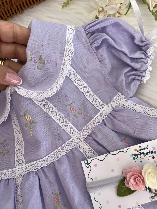 Vestido Renascer Jardim De Borboletas confeccionado no tricoline de algodão com aplicações de renda renascença no busto e bordados manuais nas nesgas.